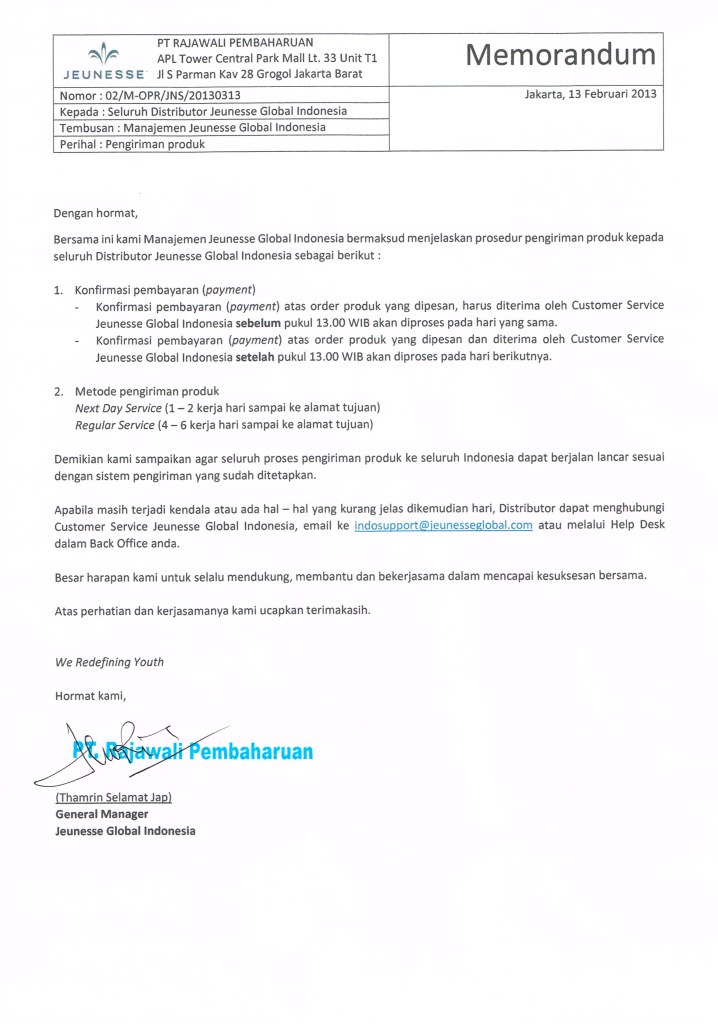 Berikut ini adalah Memorandum Resmi dari Perusahaan Jeunesse Global Indonesia Perihal Pengiriman Produk Jeunesse untuk pendaftaran member baru.