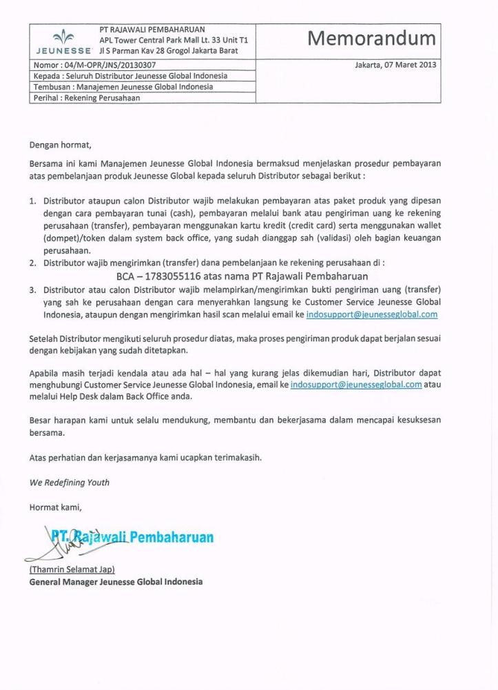 Berikut ini adalah Memorandum Resmi dari Perusahaan Jeunesse Global Indonesia Perihal Rekening Perusahaan untuk pendaftaran member baru.