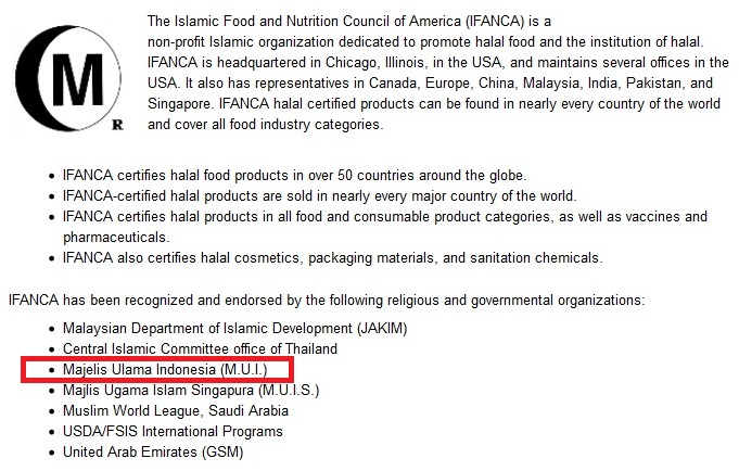 Sertifikat yang dikeluarkan oleh IFANCA menjadi acuan bagi MUI (Majelis Ulama Indonesia)