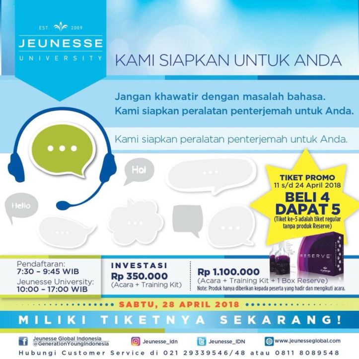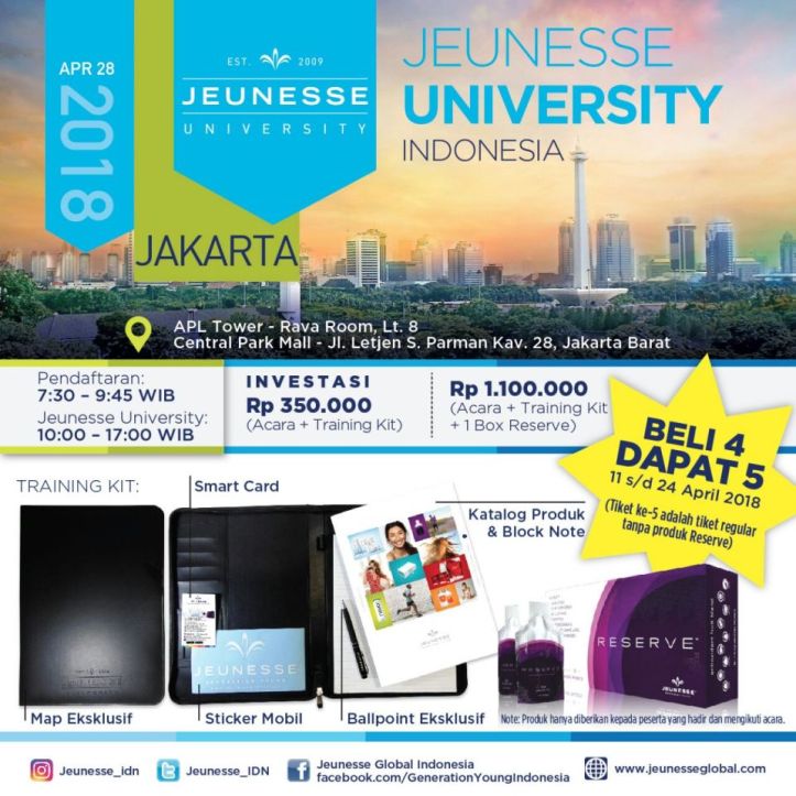 - Rp 1.100.000 (Acara + Training Kit + 1 Box Reserve Jeunesse senilai Rp 1.783.650)
