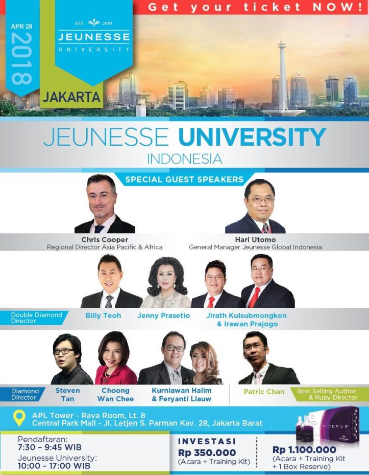 Inilah saatnya bagi Anda, para member Jeunesse Indonesia maupun yang sedang mencari tahu dan merencanakan bergabung di Jeunesse Global untuk hadir dan belajar langsung dari para Nasional dan Internasional Director dan “Corporate Executive” Jeunesse Global tentang strategi bisnis, produk dan tips sukses lainnya.