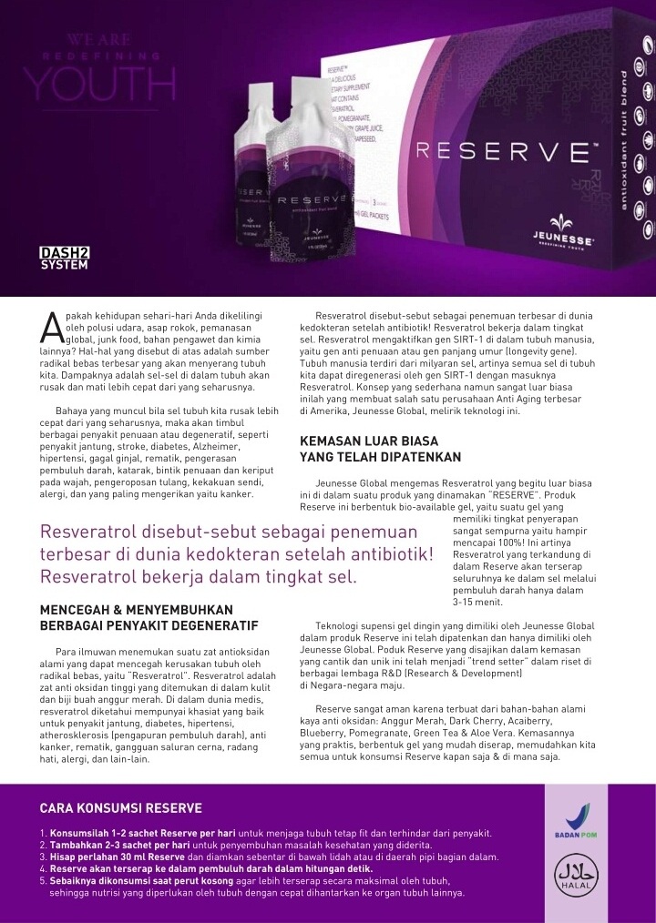 Reserve Jeunesse adalah minuman kaya akan antioksidan, berbentuk gel, kaya akan asam lemak esensial dan Resveratrol.