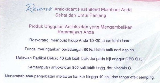 “… Di tahun yang sama mempunyai rencana untuk memproduksi Obat Anti Radang dari bahan baku Anggur Biru Probolinggo, namun keinginan tersebut mendadak berubah karena pada saat beliau pulang dari memberi ceramah di Medan mendadak sakit, dan tidak ada diagnosa yang pasti tentang penyakitnya, sampai suatu ketika seorang sahabatnya datang menjenguk dengan membawa produk RESERVE dari PT Jeunesse Global.