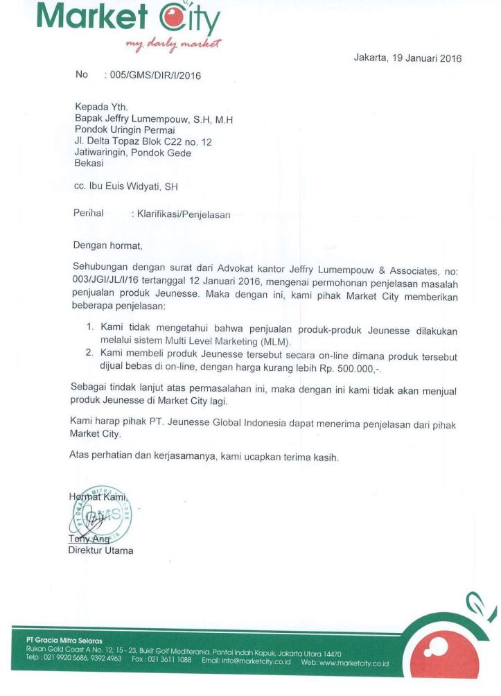 Berikut ini salah satu surat peringatan kepada salah satu Toko Online (E-commerce) yang menjual reserve jeunesse murah, dibawah harga yang ditetapkan.