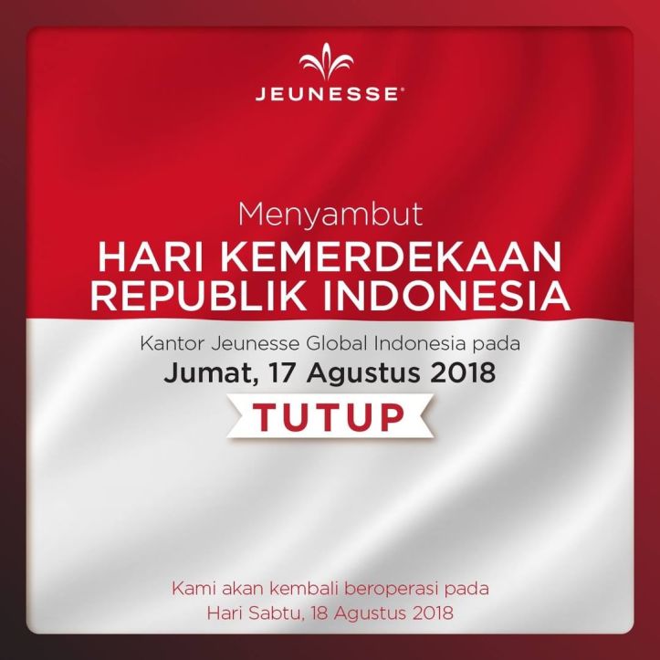 Menyambut Hari Kemerdekaan Republik Indonesia, Kantor Jeunesse Indonesia akan TUTUP pada hari Jumat, 17 Agustus 2018.