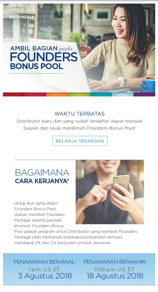 Untuk waktu yang sangat terbatas, Jeunesse Indonesia memberikan kesempatan bagi Existing Distributor maupun mereka yang baru mau bergabung di Jeunesse Global untuk mendapatkan Paket Founder.