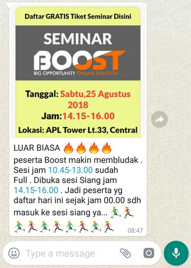 Berikut ini saya informasikan bahwa Tiket Seminar BOOST Komunitas DASH2 untuk hari Sabtu tanggal 25 Agustus 2018 sudah SOLD OUT sejak hari Selasa 21 Agustus 2018.