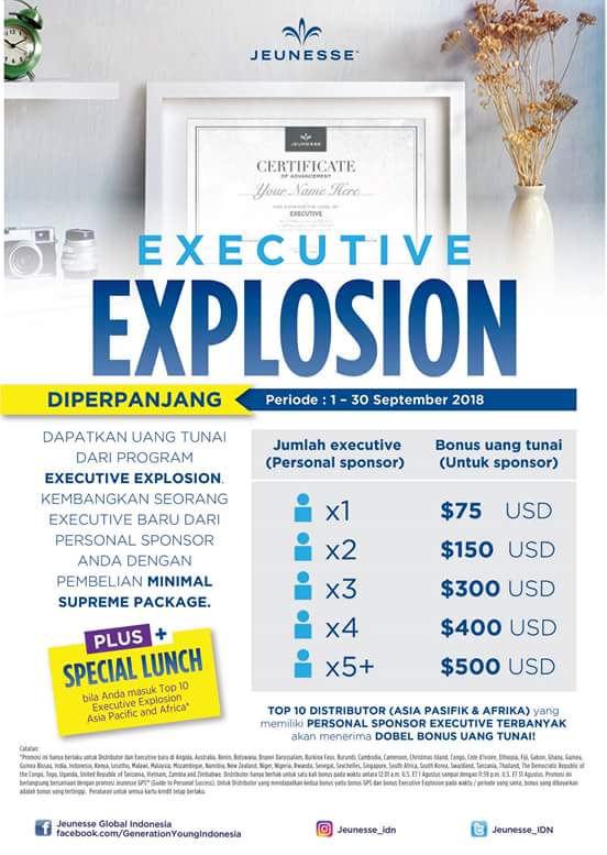Seperti postingan terdahulu disini dimana Jeunesse Indonesia meluncurkan Promo Executive Explosion yang berlaku untuk Periode 1-31 Agustus 2018.