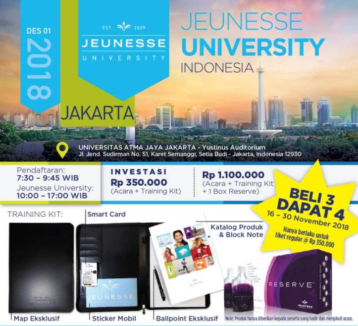 - Rp 1.100.000 (Acara + Training Kit + 1 Box Reserve Jeunesse senilai Rp 1.783.650)