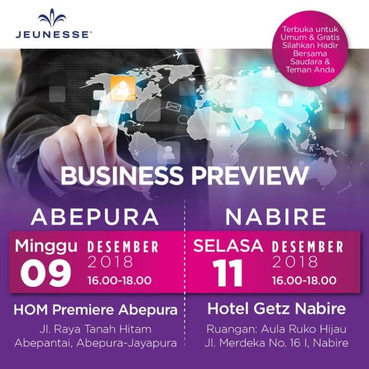 Inilah kesempatan Anda di Nabire & Abepura untuk mengetahui Konsep Bisnis Jeunesse Global Indonesia secara lengkap.