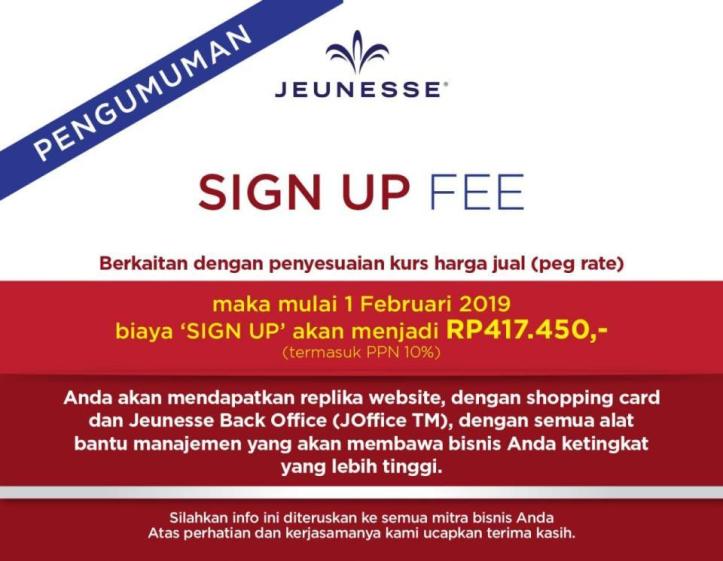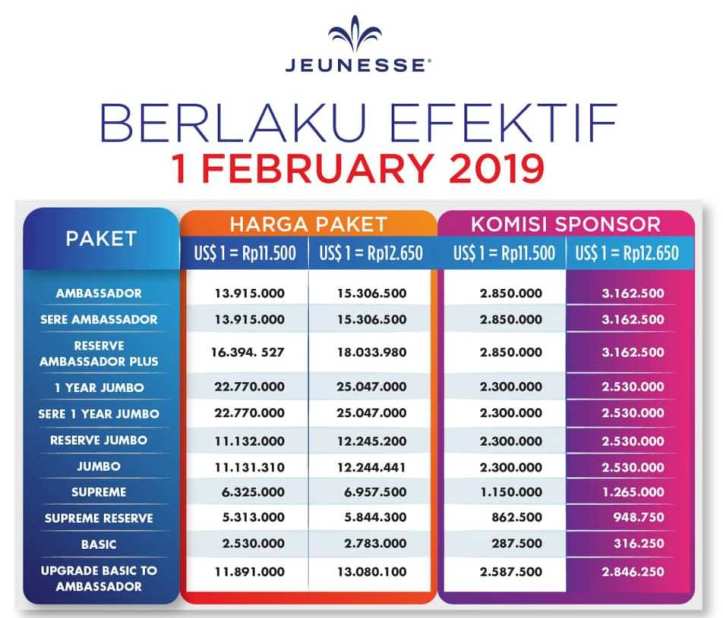 Per 1 Februari 2019, sesuai ketentuan dari Jeunesse Global USA, Kantor Jeunesse Indonesia menggunakan Kurs Terbaru untuk Harga Jual Produk dan Paket Bisnis.