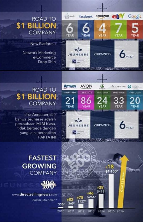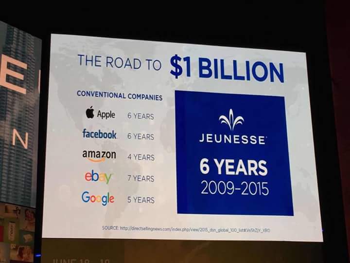 Sehingga perusahaan ini bisa disejajarkan dengan Company sekelas Facebook dan Apple. Bahkan Ebay membutuhkan waktu lebih lama dari Jeunesse untuk mencapai Annual Sales $1 Billion (dibutuhkan waktu 7 tahun).