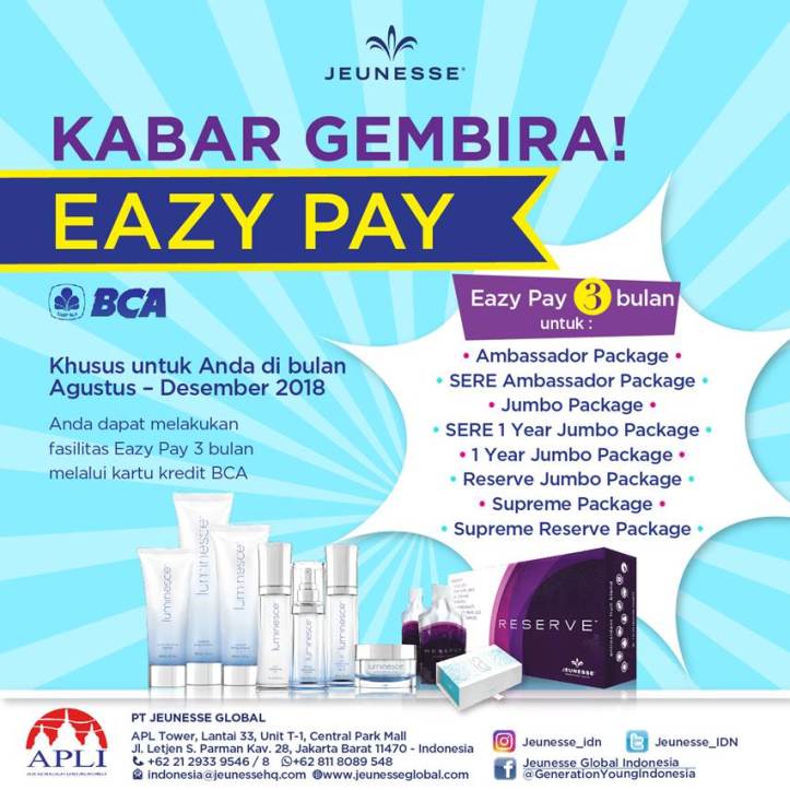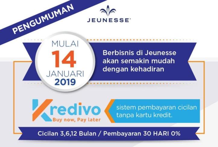 **) Kredivo bekerjasama dengan Jeunesse Global Indonesia, hanya tersedia di Jabodetabek, Bandung, Surabaya, Semarang, Medan, Palembang dan Denpasar.